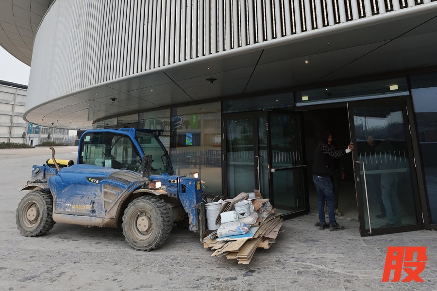 相比之下,外界最担心的是圣朱利亚冰球馆。这座原定于2022年动工的新建场馆,因为一起诉讼而不得不延期一年开工,这大大影响了工程进度。在2月4日深夜——距离5日此处的首场冰球赛(意大利女队对法国女队)只剩十余小时)——场馆内依然一片忙碌景象:叉车鸣笛声此起彼伏,空气中弥漫着油漆味,工人们忙着粉刷墙壁、摆放商品和搭建纪念品摊位;一些公共区域看起来像是刚刚完工,浴室洁具上还贴着厂家标签,门上贴着胶带,墙上还露出电线。